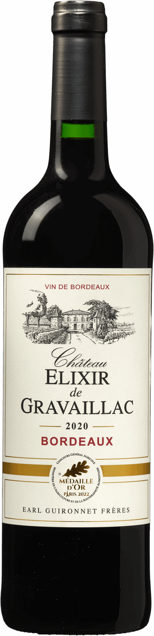 Slechts 13 hectare bestieren de broers Xavier et Philippe Guironnet van Château Elixir Gravaillac. Zij begonnen in 2001 met de aankoop van 8 hectare aan de oevers van de Dordogne nabij het dorpje Civrac. Het gehucht waar ze gevestigd zijn heet ‘Les Graves’, wat ook terugkomt in de naam van het chateau. Heel toepasselijk: de bodem is rijk aan waterdoorlatende rivierkiezels. Dit zorgt voor een laag rendement, dat verder wordt verminderd door de hoge dichtheid van ruim 5.000 stokken per hectare (ruim meer dan hun buurchateaus in de wijde omgeving) én door de hoge leeftijd ervan: dik 45 jaar. Zoals bekend levert dat alles minder druiven op, die des te rijker en intenser van smaak zijn. Dat verklaart de diepe, lange smaak.Wijngaarden Château Elixir GravaillacDe wijngaarden van Château Elixir Gravaillac bestaan vooral uit Merlot, aangevuld met Cabernet Sauvignon en een klein beetje Petit Verdot. De rode Bordeaux AOC van Xavier en Philippe overstijgt met gemak het niveau van deze appellatie