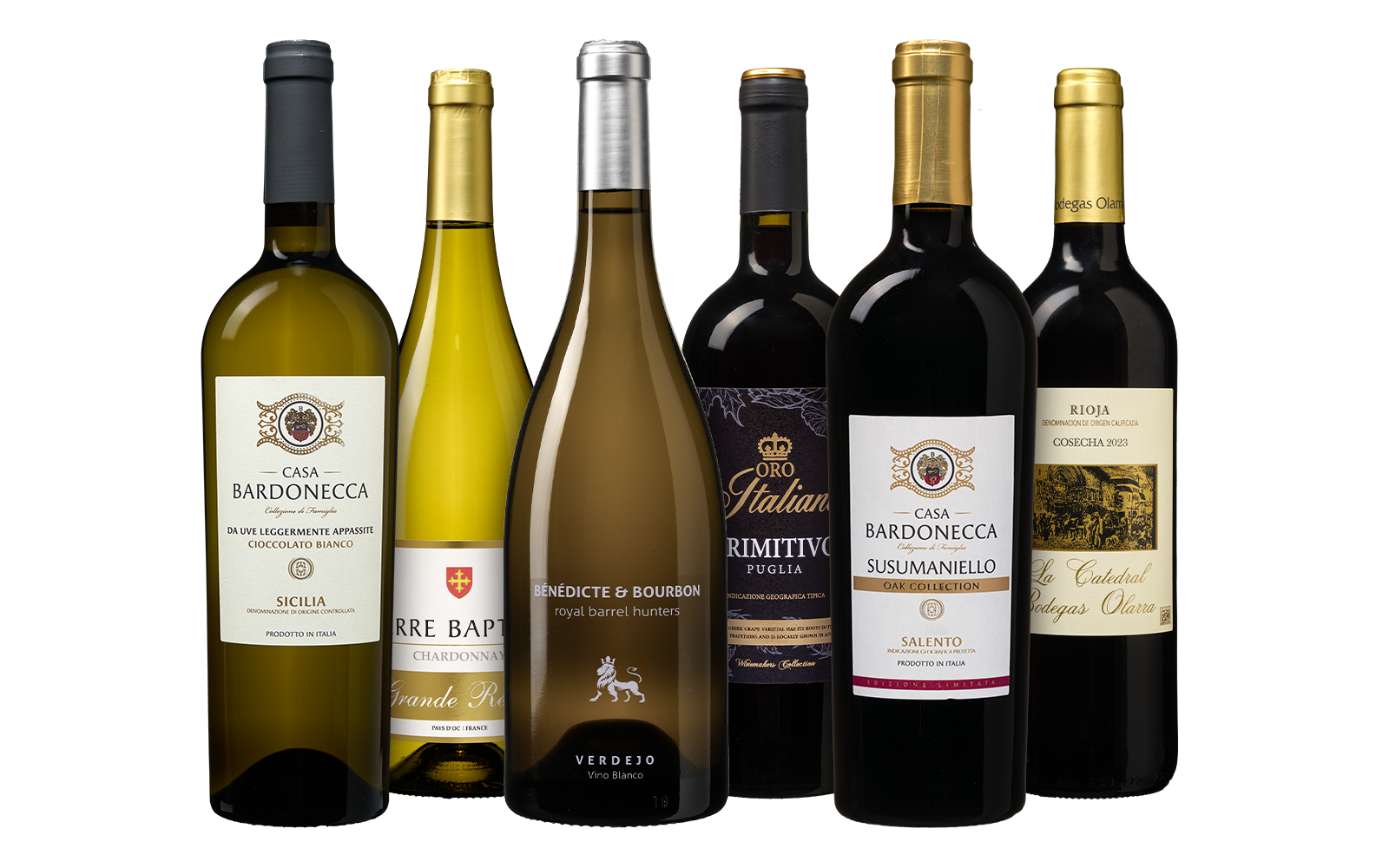 Zes publiekslievelingen in één wijnpakket! Van een rijke en frisse Grillo en levendige Verdejo tot zwoele Primitivo en krachtige Rioja. Dit pakket combineert onze bestsellers uit Frankrijk, Italië en Spanje met één doel: jou ultiem wijnplezier bezorgen. Proef zelf waarom deze wijnen favoriet zijn bij duizenden wijnliefhebbers!