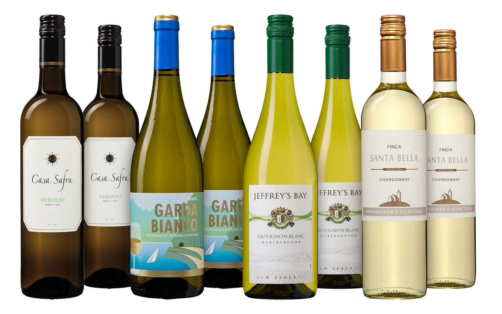 Vier witte huisfavorieten, samen goed voor acht flessen wijnplezier! In dit pakket proef je frisse Jeffreys Bays Sauvignon Blanc uit Zuid-Afrika, een sappige Casa Safra Verdejo uit Spanje, een elegante Italiaanse Bianco én een romige Chardonnay uit Argentinië. Ideaal om in huis te hebben voor elk witte wijn moment.